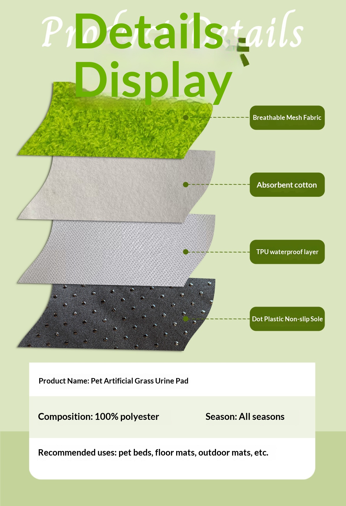 Tappetino igienico per animali in erba artificiale, traspirante e ad alta capacità assorbente